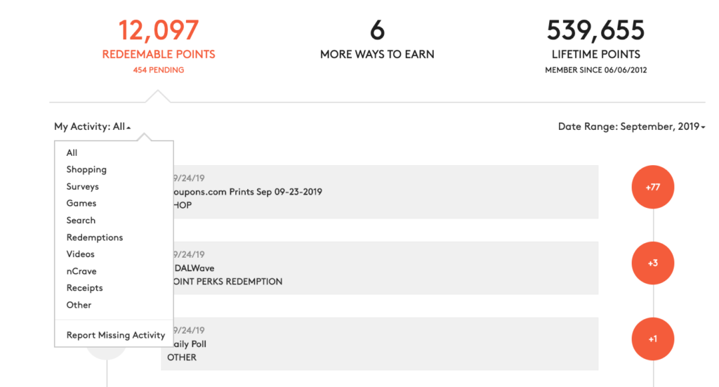 Then select the month in which you redeemed your Points using the Date Range selector in the upper right.