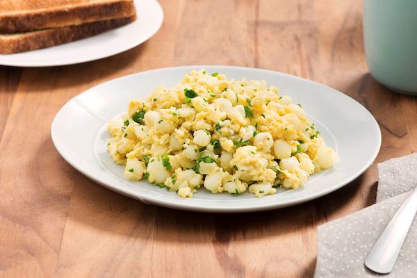 In a separate bowl, whisk the eggs; add them to the hominy, stir well until eggs are cooked; about 5 minutes.